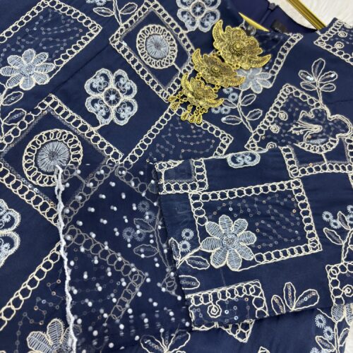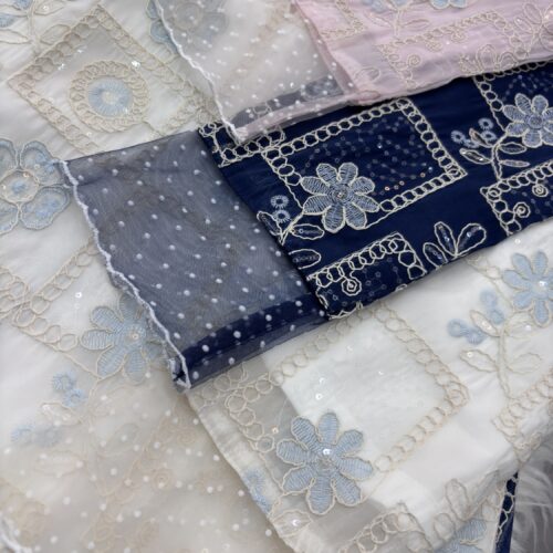 - Ada corak bunga putih yang kelihatan seperti sulam cetakan/embroidered print di atas kain.
