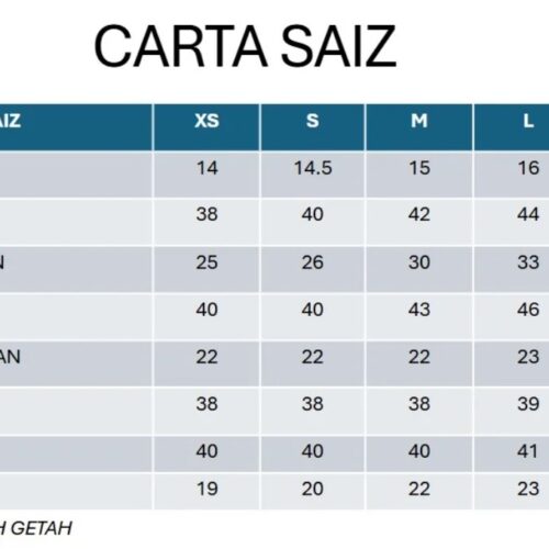 Cadangan, sila rujuk carta saiz.